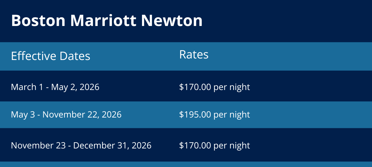 Boston Marriott Newton – 2345 Commonwealth Avenue, Newton, MA 02466 (617) 969-1000. The Boston Marriott Newton is located 5 miles from BostonSight. The hotel is located on 22 acres of land along the Charles River. Hotel room features include: in room coffee/tea maker and mini refrigerator. The BostonSight rates include complimentary high speed internet access and $10.00 discounted parking per night. There is a restaurant onsite, 24 hour fitness center and indoor pool. Rates vary by season (see chart). Blackout dates: Book the BostonSight rate by clicking here: Book your corporate rate for BostonSight or book at www.marriott.com/bosnt with promo code A2566. Blackout dates for 2026 March 27-28, April 18-20, May 15-18, June 12, 13, 15, 16, 18, 19, 22 -26, 28, 29, July 8-9, September 26-27, October 16-17.